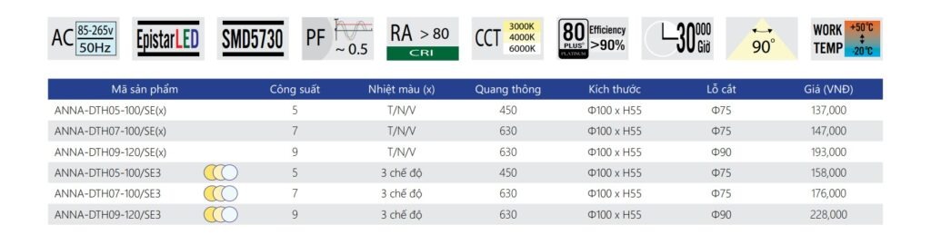 Epistar SMD 5730 (Đài Loan), tuổi thọ 30.000 giờ.