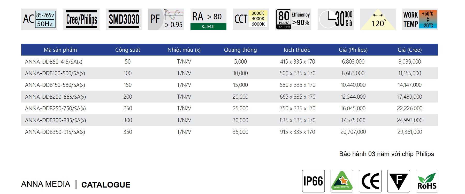 SMD Cree/Philips, tuổi thọ trên 30.000 giờ.
