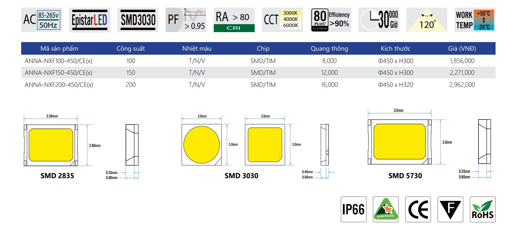 Epistar SMD 3030/Epistar TIM, tuổi thọ trên 30.000 giờ.