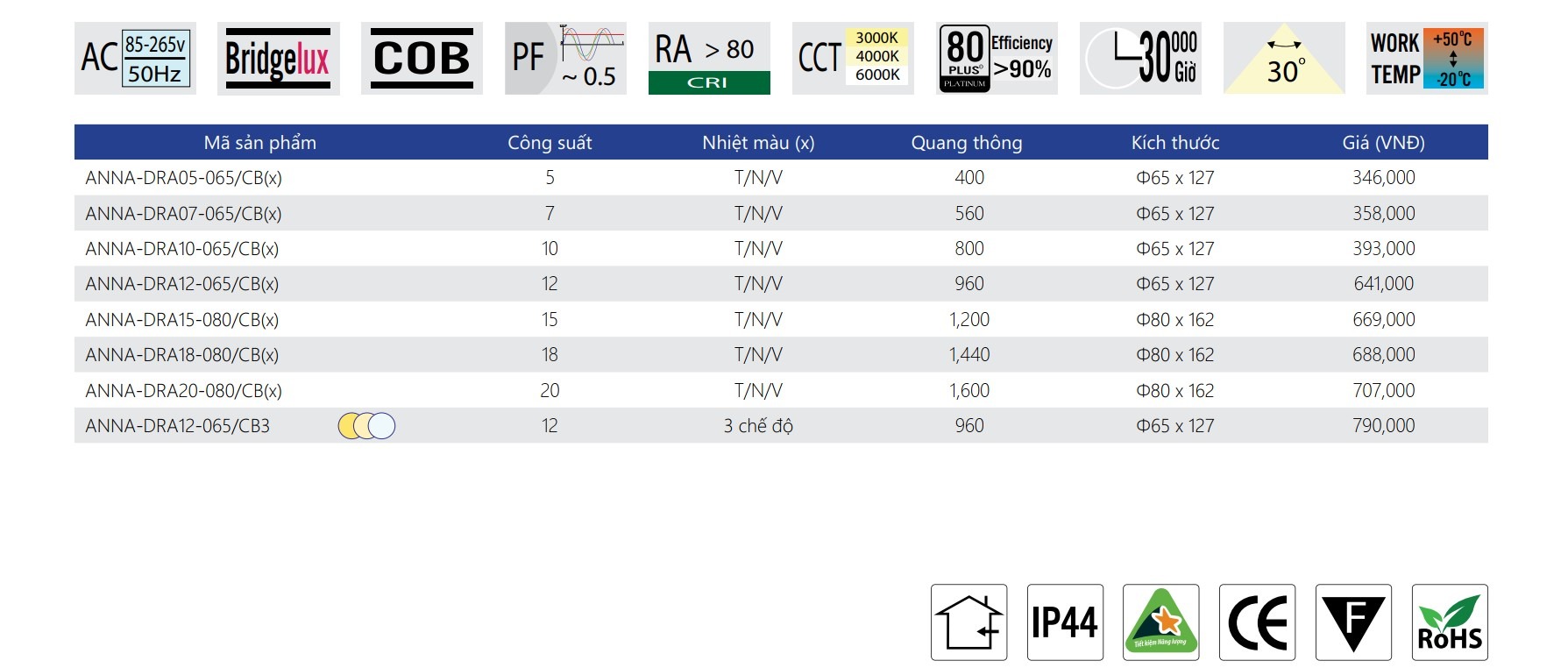 Bridgelux COB (Mỹ), tuổi thọ trên 30.000 giờ.