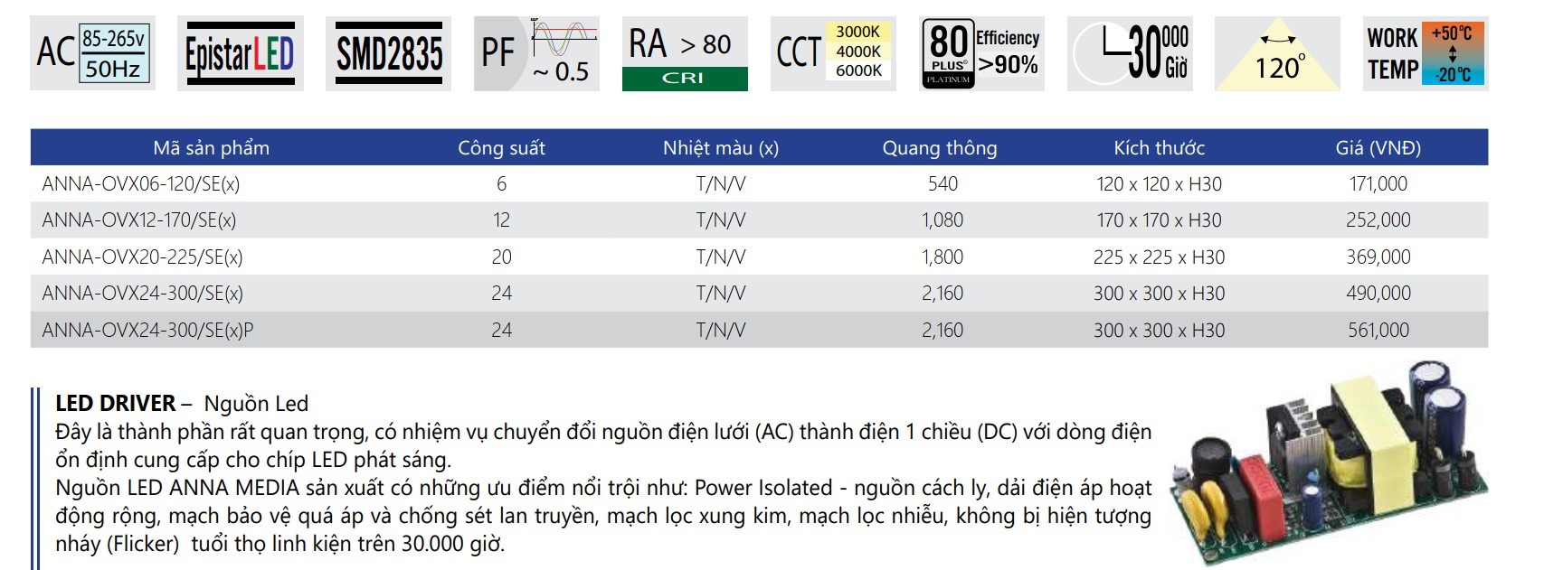 Chip LED: Epistar SMD 5730 (Đài Loan), tuổi thọ 30.000 giờ.