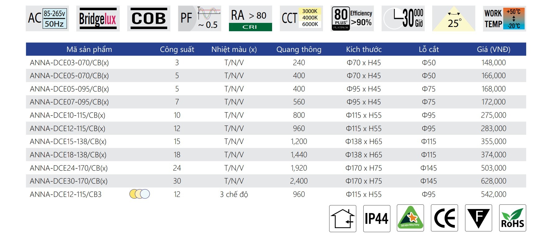 Bridgelux COB (Mỹ), tuổi thọ trên 30.000 giờ.