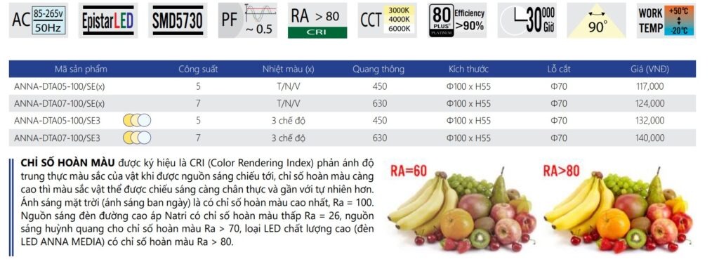 Epistar SMD 5730 (Đài Loan), tuổi thọ 30.000 giờ.
