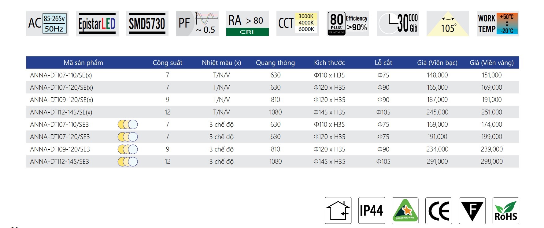 Chip LED: Epistar SMD 5730 (Đài Loan), tuổi thọ 30.000 giờ.