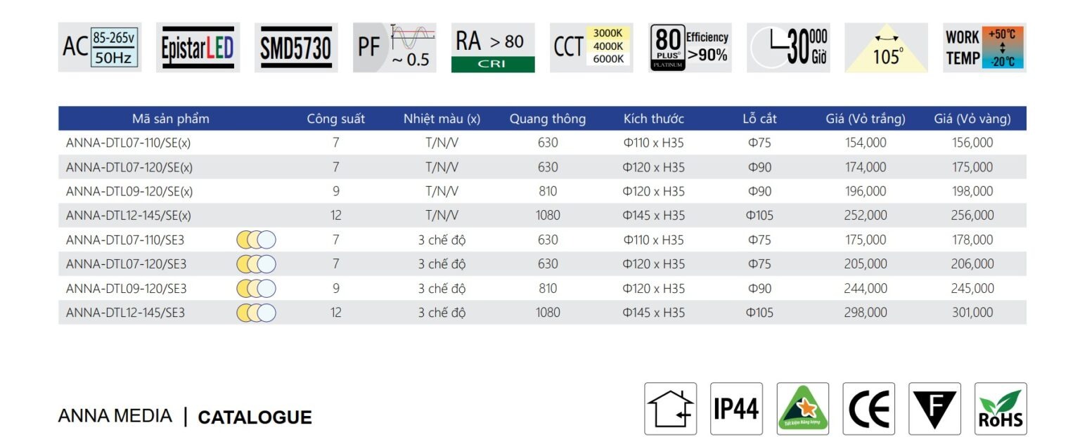 Chip LED: Epistar SMD 5730 (Đài Loan), tuổi thọ 30.000 giờ.