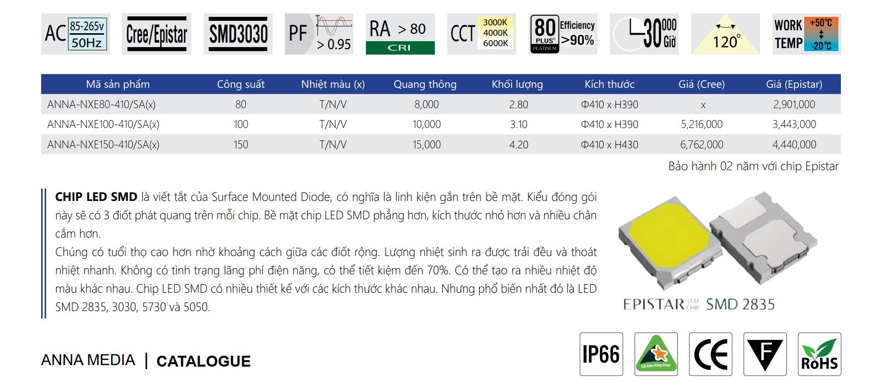 Cree/Epistar SMD 3030, tuổi thọ trên 30.000 giờ.