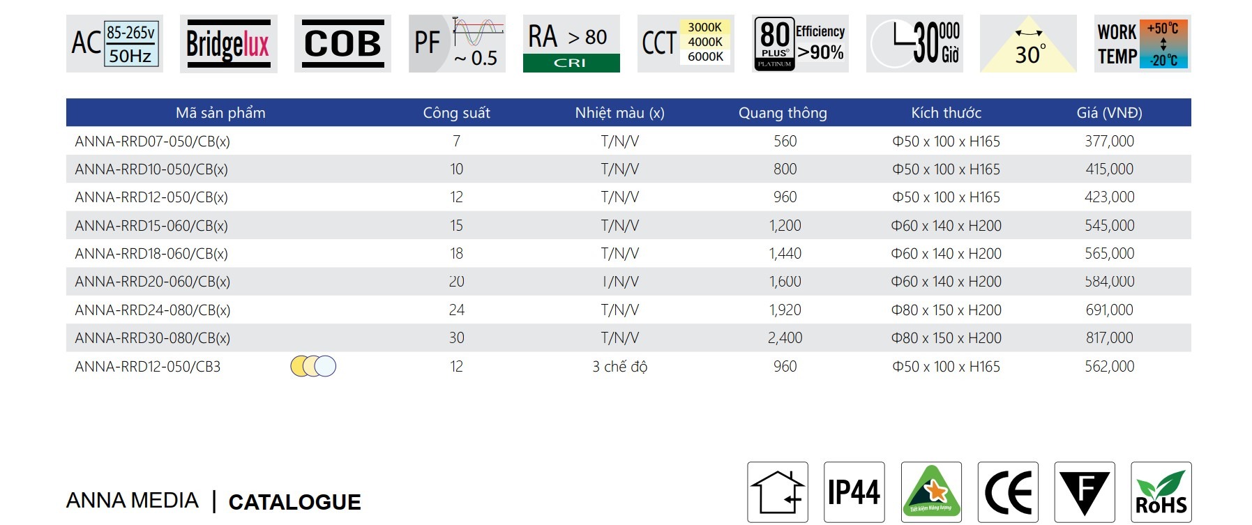 Bridgelux COB (Mỹ), tuổi thọ trên 30.000 giờ.