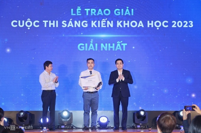 TS Nguyễn Đoàn Quốc Anh (ở giữa) nhận giải Nhất cuộc thi Sáng kiến Khoa học 2023 với giải pháp TIR lens mới cho đèn LED công suất cao. Ảnh: Giang Huy